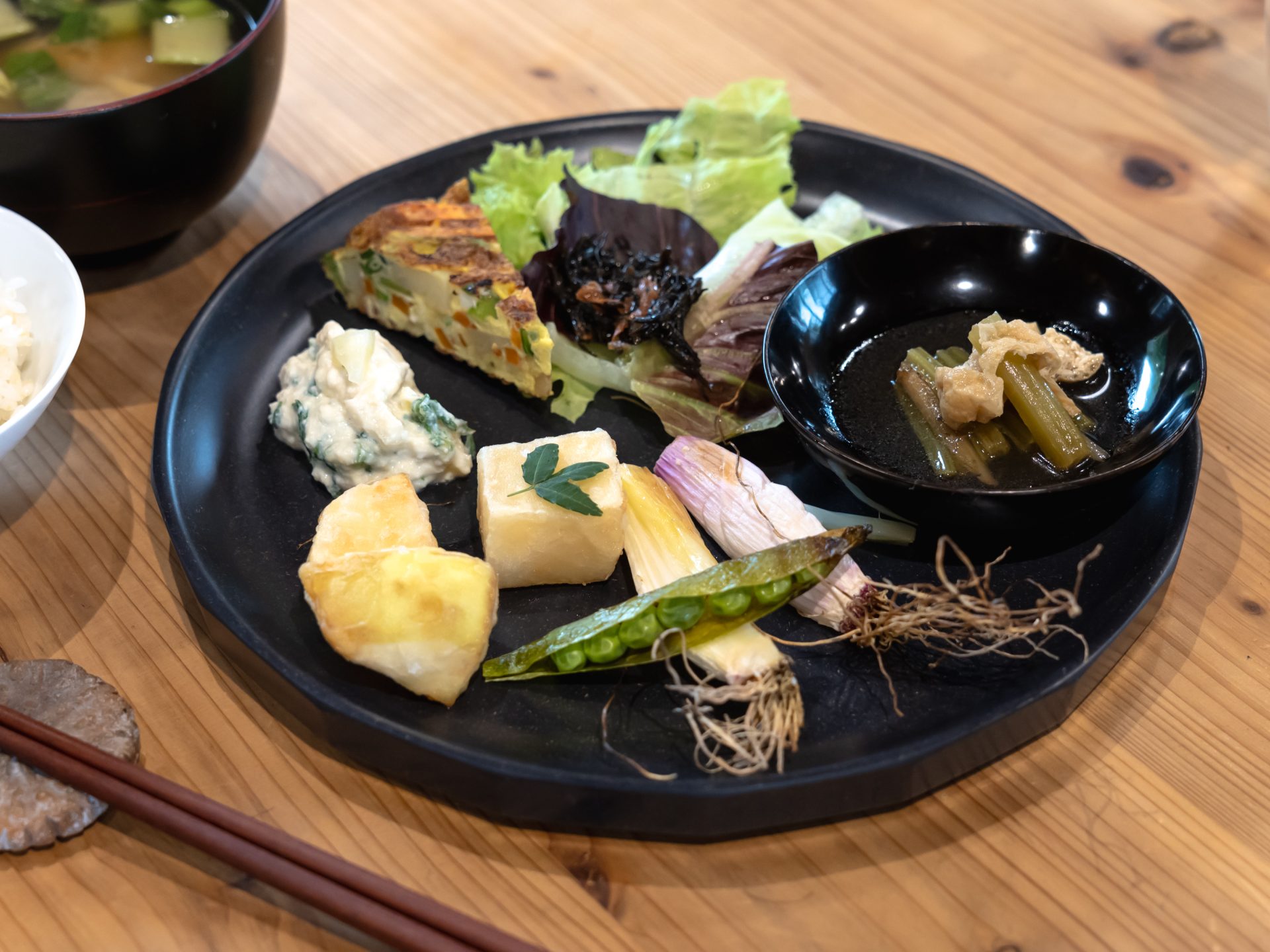 当日は、わろうださんの常連のお客さんもたくさんいらしていて、アットホームな雰囲気の中、楽しい時間を過ごさせていただきました。生憎の雨でしたが、わろうだの出口さんが言っていた通り、雨に濡れた山や木々はとても美しかったです。お昼にはわろうだ特製ランチ(どれも主役級で絶品の野菜たち)、ティータイムには美味しい珈琲とシフォンケーキをいただいてお腹も優しく満たされました。