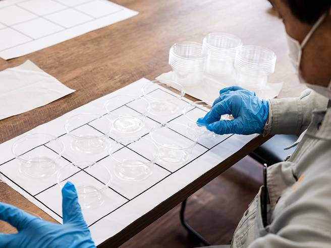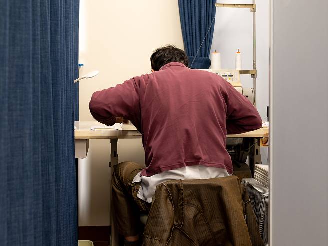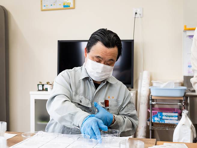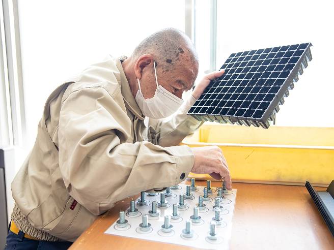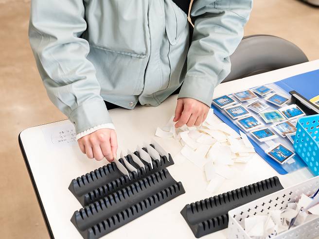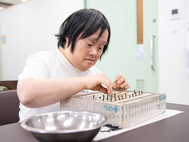 利用者さんがご自分で作業ができるよう、数や組み合わせ、大きさを揃えられる道具を考えます。活動時に周りが気になる方は、個室やパーテーションを活用し、その人が活動しやすいスペースを確保します。