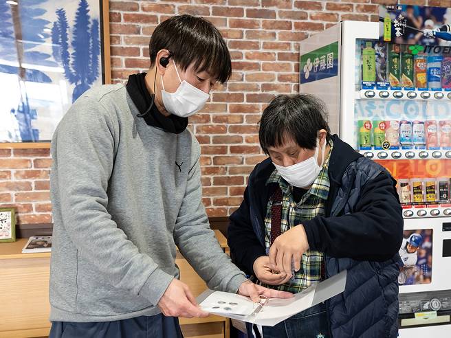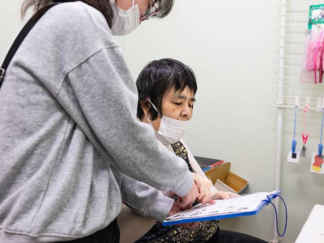会話のほかに、筆談やイラスト、写真など視覚的に提示し、利用者さんがしたいことを自分で決められるよう、ひとりひとりに合せて支援しています。