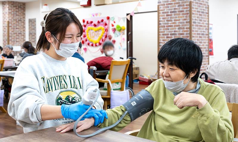 嘱託医、看護師、栄養士、理学療法士、作業療法士、相談員と連携し、バイタルチェック、食事形態の検討、服薬管理など利用者さんの体調管理や、安定した姿勢の取り方や身体の動かし方の相談・指導を受けています。