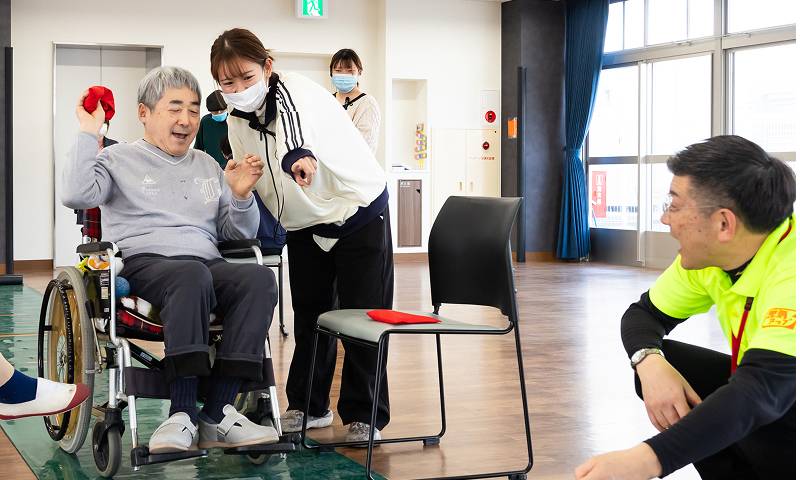 兵庫県レクリエーション協会の講師を招き、音楽に合わせて体操やチーム対抗でゲームを実施。座ったままでも参加できる道具や、無理なく身体を動かせるプログラムで心身のリフレッシュを図ります。
