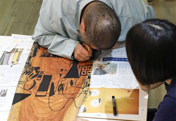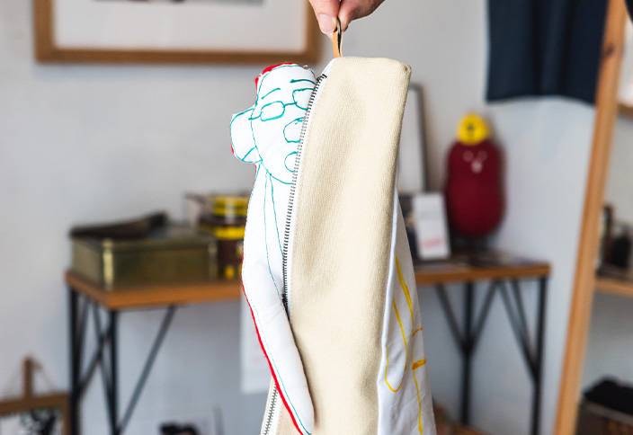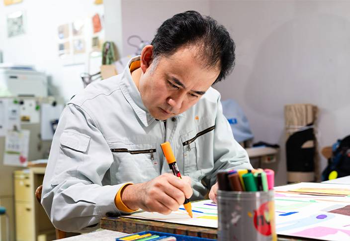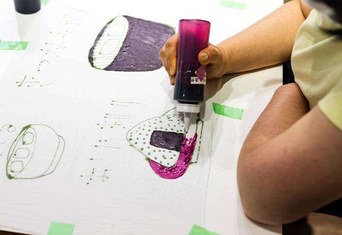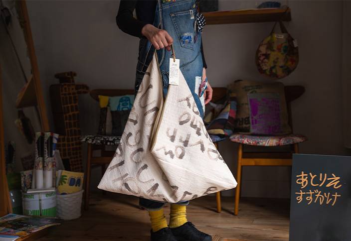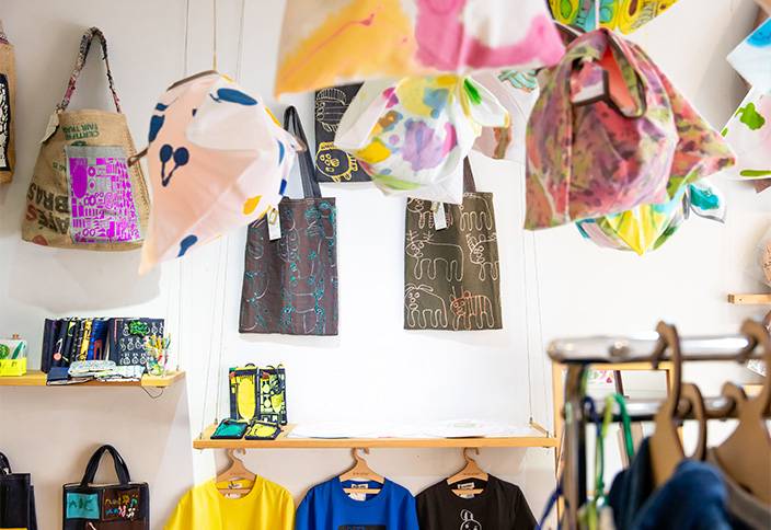 【あとりえすずかけ】活動をするメンバーの皆さんは、一羊会が運営する事業所に所属する利用者さんです。創作することが好きで得意な方達が、月に1、2回やってきて専属のスタッフと一緒にTシャツやてぬぐい、雑貨といった商品を作っています。