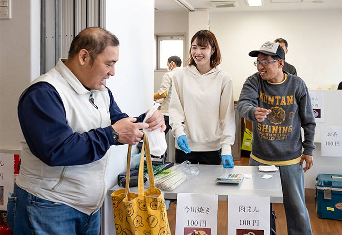 公園の除草や建物清掃、菓子の配達など、日常的に地域の中で働き、関わる機会があります。「地域に開かれた場所をつくろう」という思いで開設した「Aptime CAFÉ -アプティムカフェ-」は、焼き菓子や石けん、布巾など一羊会の自主製品を販売。ほかにも地域に出店者を募って開催するイベントの実施など、普段は事業所と関わりのない方も気軽に立ち寄れる地域に開かれた事業所づくりを目指しています。