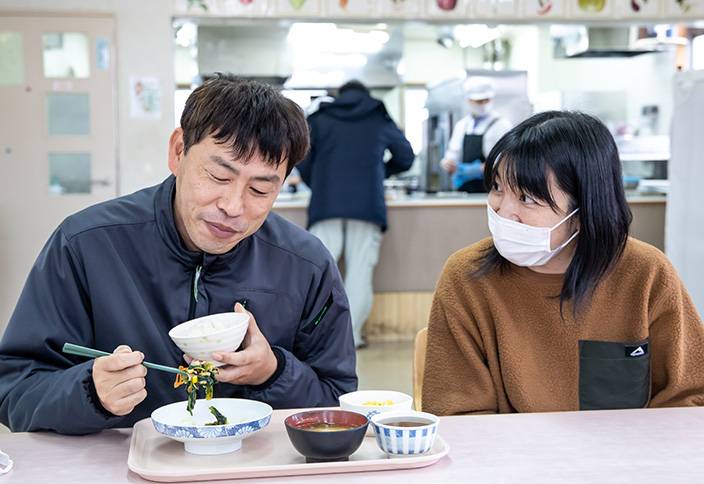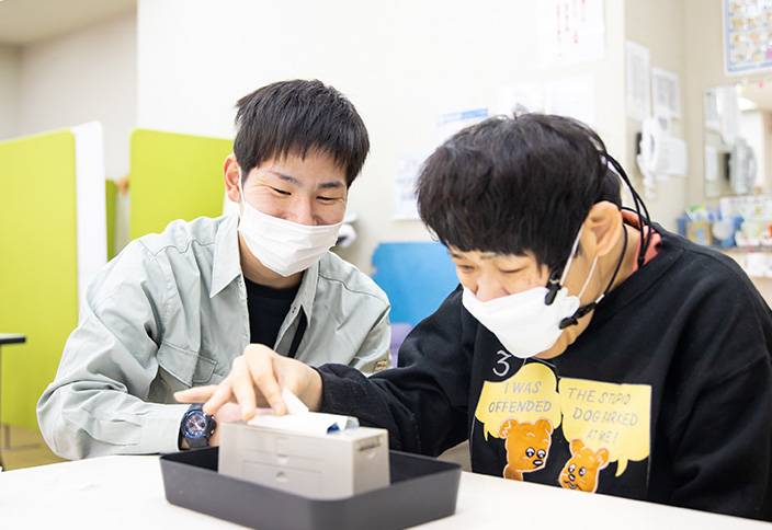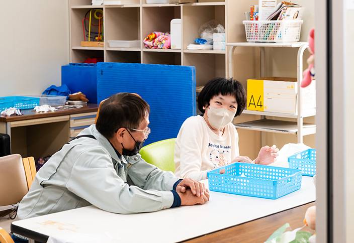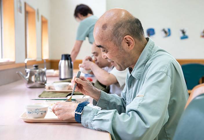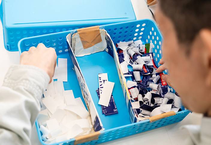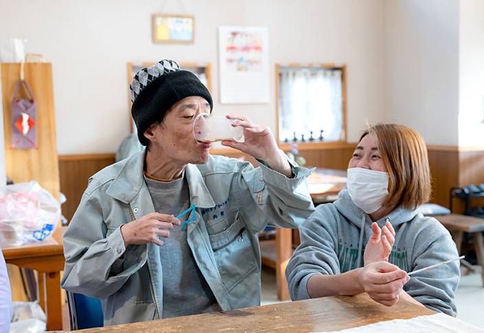 達成感や自信を得ることで働く力、働き続ける力を身に付けられるよう支援しています。新しい作業にチャレンジする人、健康維持をベースに作業する人、それぞれの年齢や体力に合わせた内容で、利用者さんが主体的に働くことを大切にしています。また、看護師、作業療法士、摂食嚥下障害認定看護師など専門職からの助言を日々の支援に活かし、心身ともに健康に過ごせるよう取り組んでいます。他にも機能訓練や外部講師によるアロママッサージ、音楽のワークショップなど作業以外の活動メニューも豊富に取り揃え、個別のニーズに柔軟に対応しています。