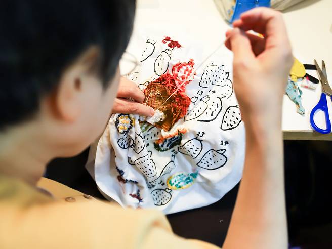 「生地の八つ折り」「工業用ミシンでの直線縫い」「自由なデザイン縫い」「完成ふきんの二つ折り」「商品封入」の工程を、ひとりひとりの長所を活かし得意な作業に携わることで素敵なふきんに仕上がっています。