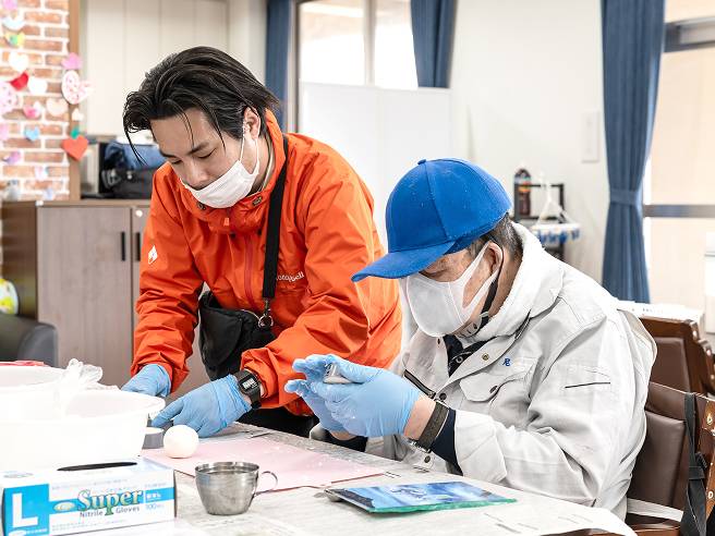 15人ほどのメンバーが、月に1度か2度、それぞれ所属する事業所からやってきて創作活動をしています。皆さん普段は、内職作業や屋外での清掃作業などを行っています。