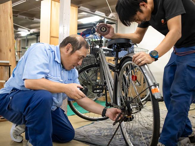 返還所から自転車の運搬にはじまり、解体、車体磨き、サビ取り、塗装、タイヤやチューブ交換、オートライトの取り付け、カゴやベル、荷台、サドル等の部品の交換などいくつもの工程を利用者さん全員で分担。職員は作業の割り振りや細かい整備、汚れチェック、仕上げなど利用者さんをサポートする形で一緒に作業しています。